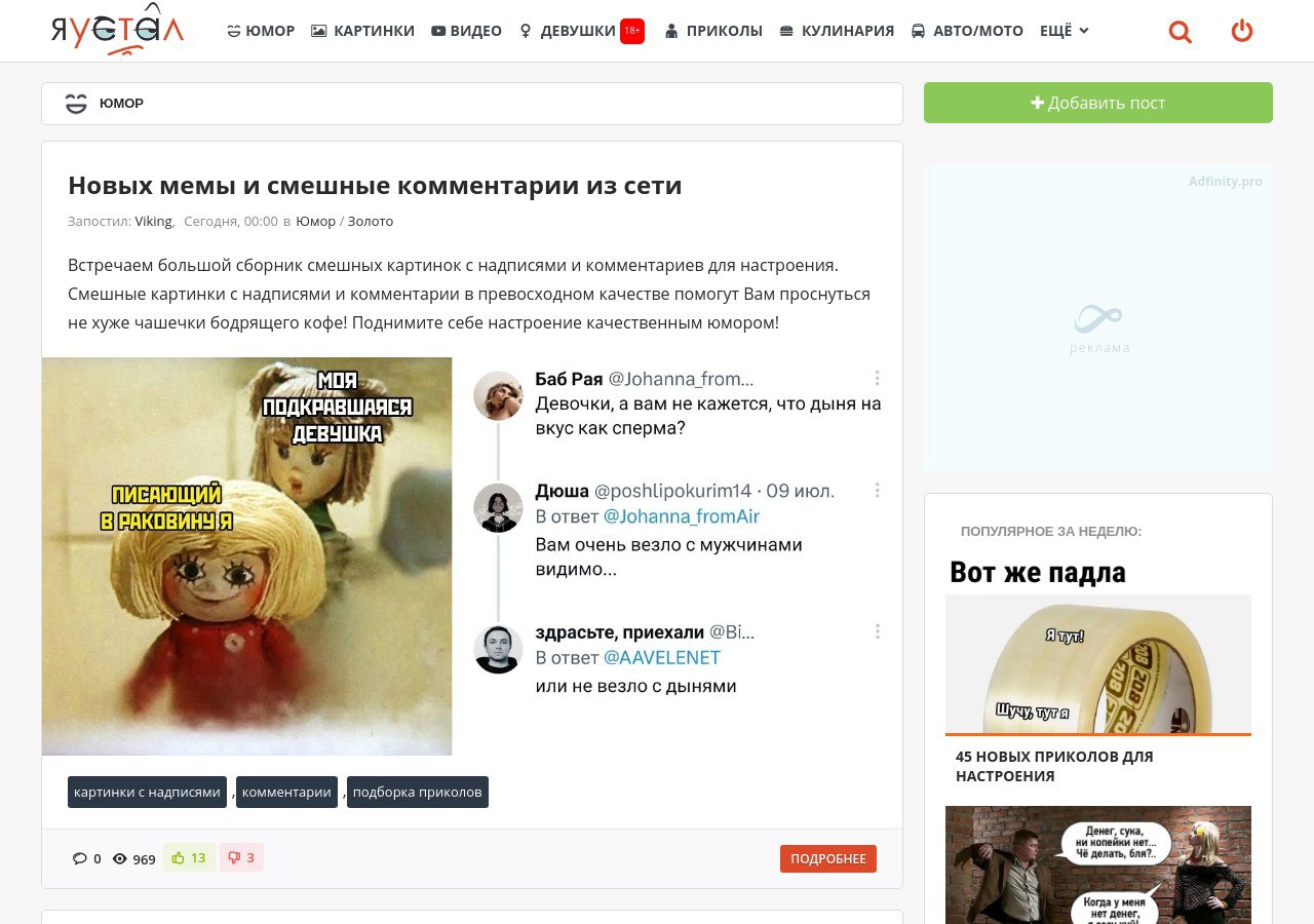 Зачастую, интернет юмор основывается на актуальных событиях и трендах. Мемы, представленные на https://yaustal.com/yumor/, которые быстро распространяются в сети, являются ярким примером этого. Они создаются для того, чтобы вызвать улыбку у пользователей и стать объектом обсуждения. Некоторые мемы становятся настолько популярными, что становятся частью повседневной жизни и получают широкую известность.